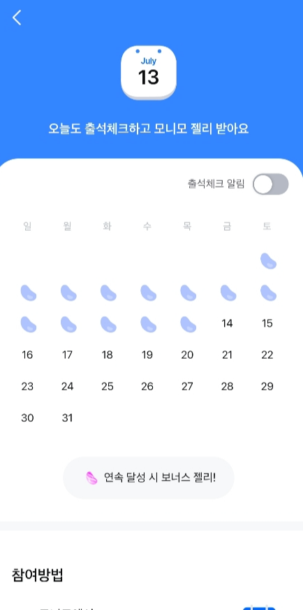 메인화면 제일 위에 스크롤을 하면 출석체크 페이지로 바로 이동하고, 오늘에 해당하는 날짜를 누르면 젤리가 바로 지급됩니다. 젤리는 10~20원 정도 평균적으로 나오고 레벨 5는 15~30원 정도 나옵니다. 한 달 출석을 빠지지 않고 하면 1,000원 정도의 스페셜 젤리가 지급됩니다.