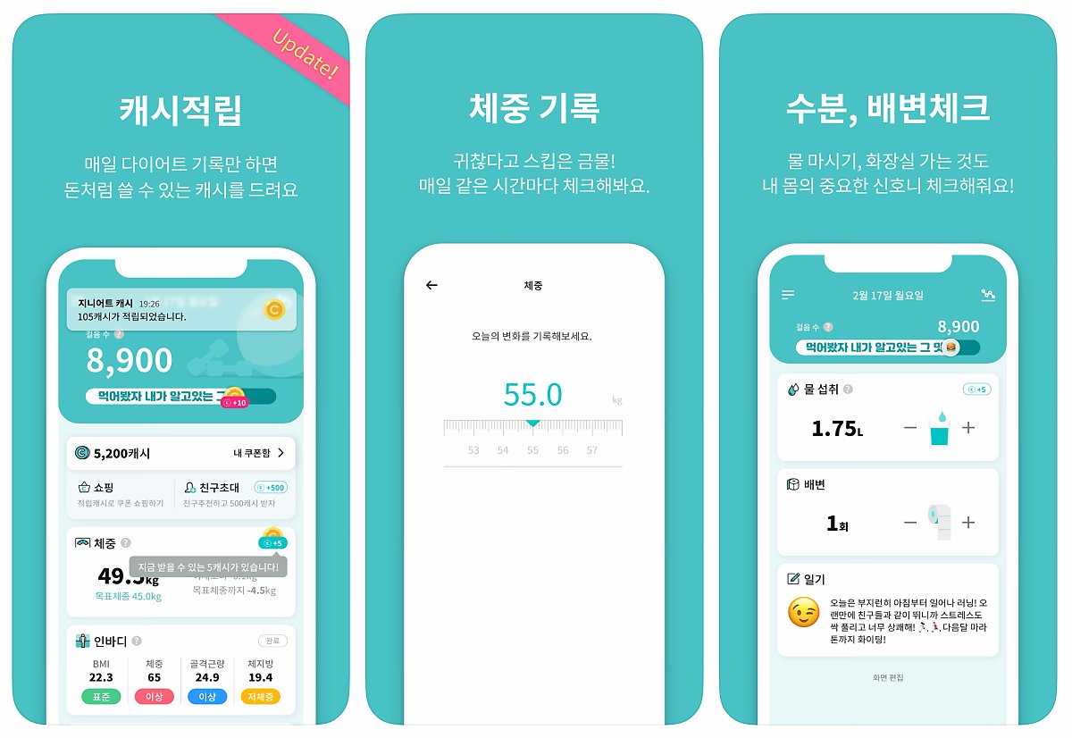 ☞ 장점: 걷기 포인트 적립 외에도 다이어트에 필수적인 체중과 다이어트를 보다 습관적으로 관리할 수 있도록 도와줍니다. 이외에도 수분섭취 수분 체크, 배변 체크, 일지 등을 한 번에 관리할 수 있습니다.