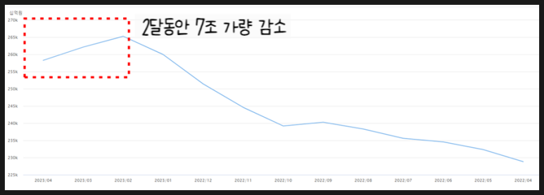 4월까지는 7조 원인데 5월부터 6월까지는 자료가 나오지 않는데 이런 추세가 유지된다면 10조 원 이상 줄어들 것으로 예상됩니다...물론 견적입니다만, 아직 한국은행에서 사용할 수 없기 때문에 5월치를 확인할 수 없습니다..