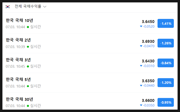 시장금리를 나타내는 10년물 국채금리도 3.6450%로 기준금리와 큰 차이가 없고 코픽스 등 다른 금리와 큰 차이가 없습니다.
