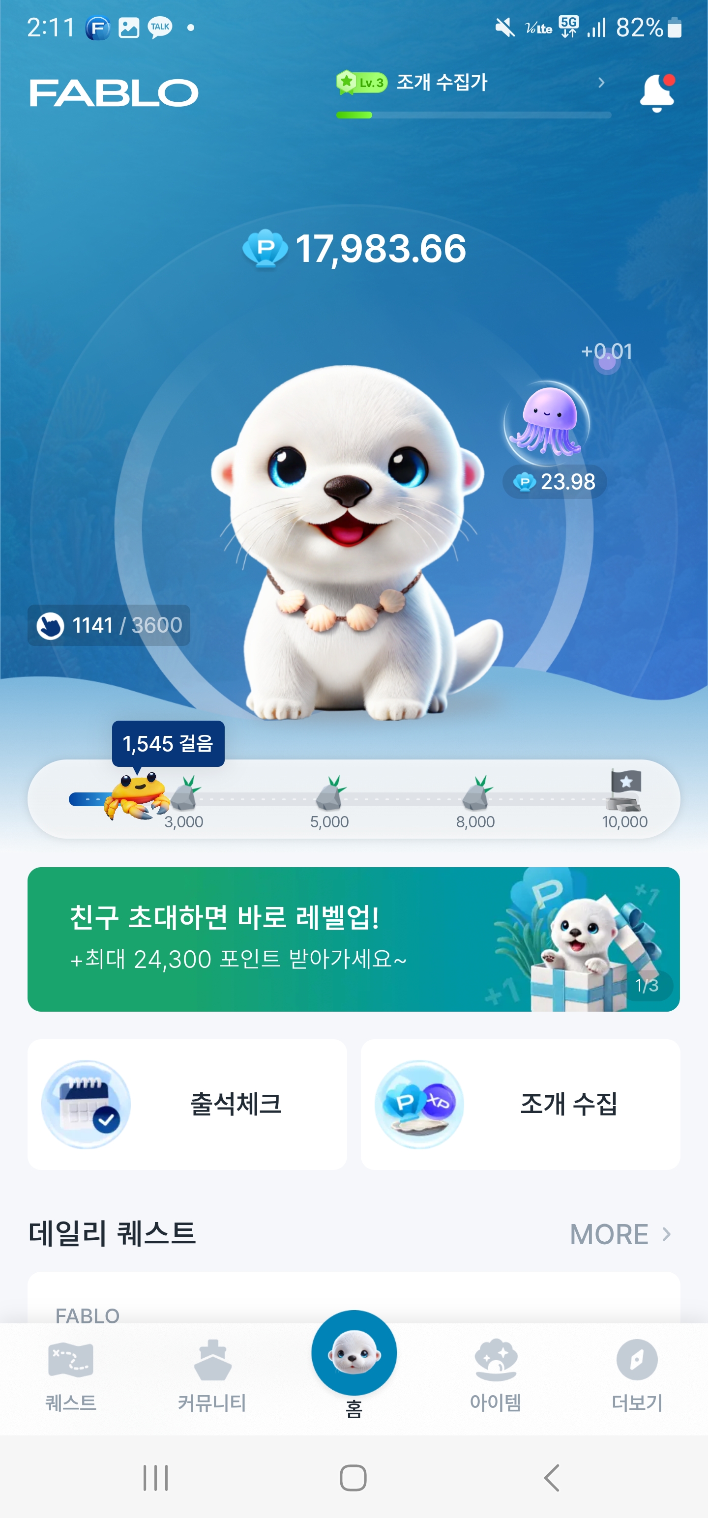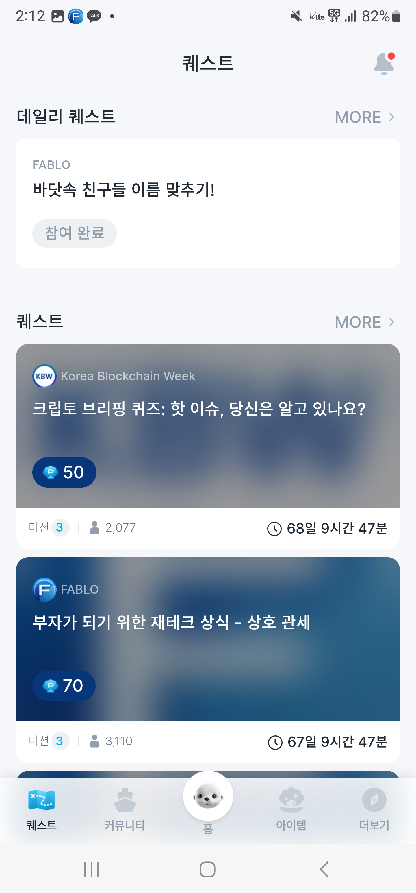 가입을 완료했다면, 이제 홈 화면에 뜨는 다양한 미션들을 하나씩 수행하며 포인트를 적립해 보세요. 특히 퀴즈 미션을 받기 위해서는 FABLO 앱 내의 소셜 계정을 팔로우 하셔야 하는 것 잊지 마시고, 팔로우 후에 퀘스트를 수행하면 정말 손가락만 몇 번 움직이면 포인트가 쌓이는 신세계를 경험하게 되실 겁니다.