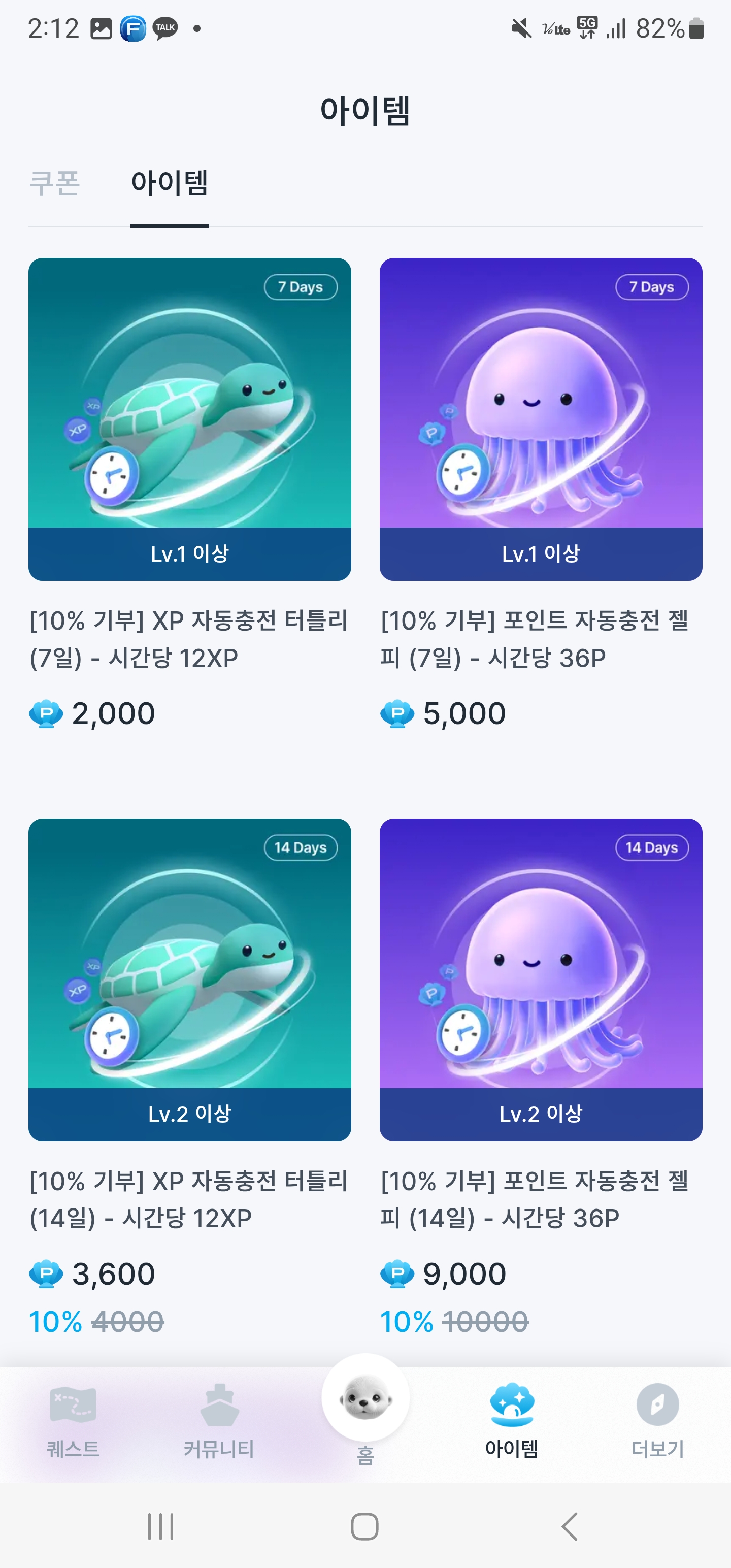 또한 아이템을 적극적으로 사용하셔야 됩니다. 자동충전 아이템은 기존에 탭 미션 포인트를 대체하는 것이 아닌 추가로 지급되는 것이기 때문에 레벨을 빠르게 2로 올린 이후에 14일짜리 자동충전 젤피 아이템을 무조건 구매하셔서 해야합니다. 특히 14일짜리 아이템은 지금 10% 할인을 해서 사용하고 8시간 마다 포인트 획득 버튼을 눌러주는 것 만으로도, 하루 221포인트 씩 벌 수 있으니 이것을 하지 않는다면 FABLO에서 큰 수익을 기대할 수 없습니다.