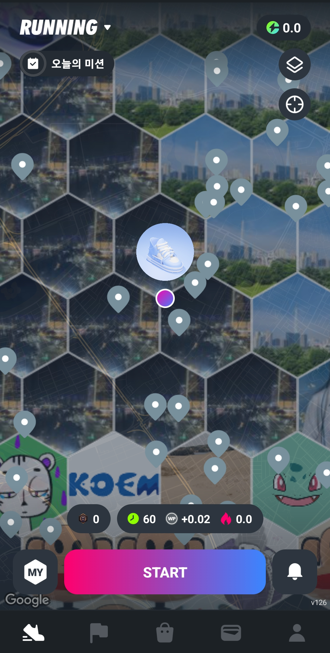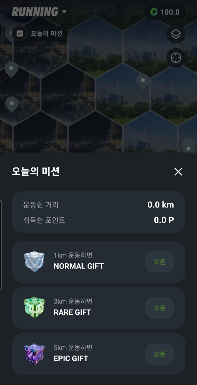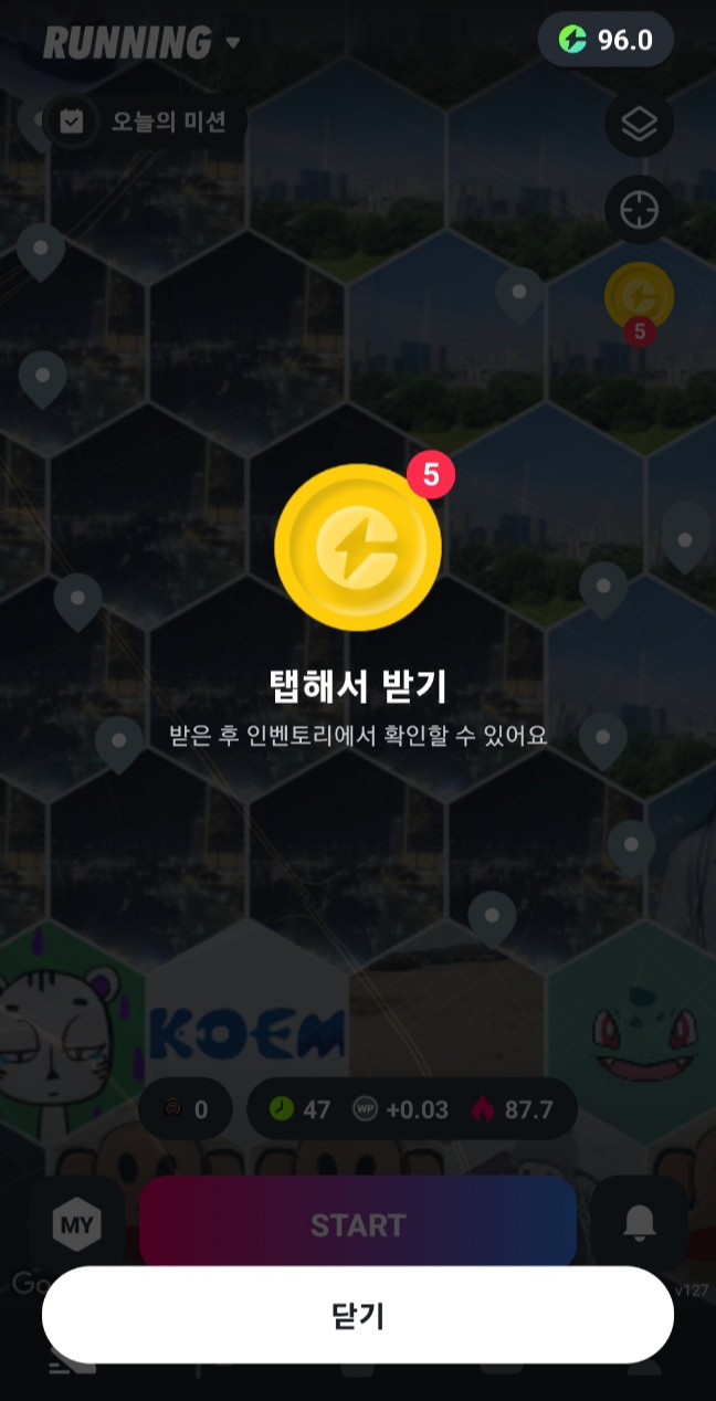 운동을 기록하여 포인트 및 토큰을 벌어 래플과 랜드 점령을 통해 멘징(코인을 벌어 원금을 회수)할 수 있는 앱입니다.